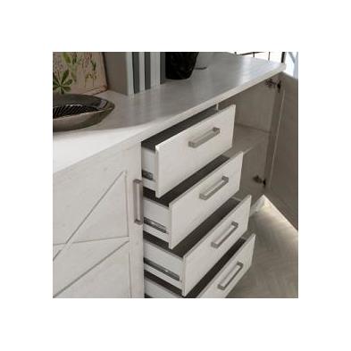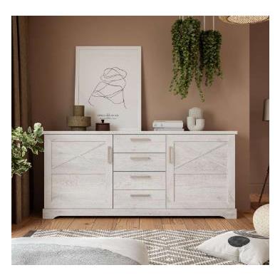 Añade elegancia y practicidad a tu salón o comedor con este aparador en color blanco pino, diseñado para ofrecer un amplio espacio de almacenamiento con sus dos puertas y cuatro cajones.