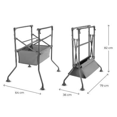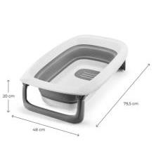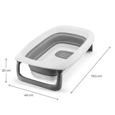 Multifuncional – posibilidad de 5 configuraciones: bañera sola, bañera sobre estructura, bañera con cambiador sobre estructura, cambiador sobre estructura y colgado en el lateral. Cambio fácil de bañera a cambiador. Plegado plano de la bañera gracias a la parte de silicona y estructura compacta. Estructura estable con patas antideslizantes. Desagüe con manguera larga – 151 cm. Cesta para accesorios.