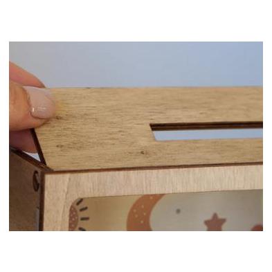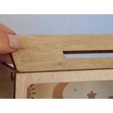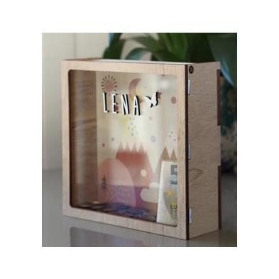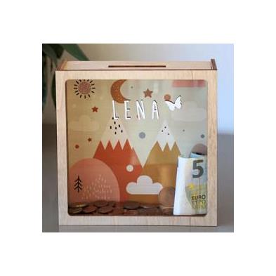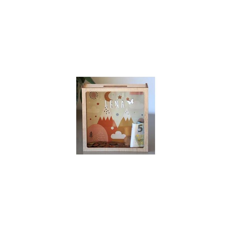 Descubre nuestra hucha de madera personalizada con diseño de montañas el regalo perfecto para niñas y niños. Fabricada con madera sostenible, esta hucha combina diseño único y funcionalidad.Personalízala con un nombre o frase especial en letras de madera blanca para que sea completamente única.Ideal para enseñar a los pequeños a ahorrar de manera divertida o como un espacio secreto donde guardar pulseras, notitas o sus tesoros más preciados.Características principales:Material: en madera proveniente de bosques sostenibles.Diseño: fondo decorativo de bosque.Personalización: incluye letras de madera para añadir un nombre o frase especial.Multifuncional: perfecta como hucha y para almacenar pequeños secretos o recuerdos.Dimensiones: 16,5 x 16,5 x 5,5 cm.Regala un detalle único que fomente la creatividad y el ahorro, ¡perfecto para cumpleaños, bautizos o cualquier ocasión especial!.