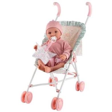 Tamaño Ideal: Especialmente indicada para muñecas de 40 a 50 cm, proporcionando un ajuste cómodo y seguro.Altura del Manillar: El manillar tiene una altura de 62 cm, adecuado para niños mayores, asegurando comodidad y facilidad de manejo.Estructura de Metal Lacada en Blanco: La estructura metálica es robusta y duradera, con un acabado lacado en blanco que le da un toque elegante.Ruedas y Asas en Rosa: Las ruedas y las asas están diseñadas en un encantador color rosa, con las asas recubiertas de espuma para un agarre cómodo.Tela de Algodón: La tela es de algodón suave y duradero, con un volante de tela doble que añade un toque de elegancia.Incluye Bolsa a Juego: Viene con una práctica bolsa para llevar todos los accesorios necesarios para el cuidado de las muñecas.Diseño Plegable: Se pliega fácilmente, ocupando muy poco espacio para un almacenamiento y transporte sin complicaciones.Acabados de Calidad: Cada detalle ha sido cuidadosamente diseñado para asegurar un producto sólido, estable y de alta calidad.Juguete de Imitación: Ideal para el juego de imitación, permitiendo a las niñas emular a sus padres y desarrollar habilidades sociales y de cuidado.Beneficios:Fomenta la Imaginación: Estimula el juego de rol y la creatividad, permitiendo a las niñas imaginar diversas situaciones de cuidado de muñecas.Juego Completo: Incluye una bolsa a juego, proporcionando todo lo necesario para el cuidado de las muñecas durante los paseos.Versatilidad y Diversión: La capacidad de plegarse fácilmente ofrece opciones adicionales de juego y almacenamiento, aumentando la versatilidad de la silla.Facilidad de Transporte: Su diseño plegable y compacto la hace perfecta para llevar de un lugar a otro sin esfuerzo.Especificaciones Técnicas:Dimensiones del Producto: 62 cm (alto del manillar)Materiales: Estructura de metal lacada en blanco, ruedas de plástico rosa, asas de espuma rosa, tela de algodón.Incluye:1 Silla de paseo plegable.1 Bolsa a juego.