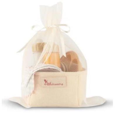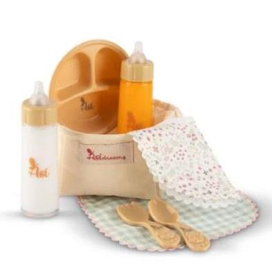 Contenido: Plato, cubiertos, 2 baberos con distintos estampados, 2 biberones mágicos (zumo y leche), cestita de tela.