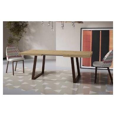 Mesa para comedor con una estructura extensible. Fabricada tanto su tapa como el extensible en madera de gran resistencia. Sus patas por otro lado, son metálicas, en acabado marrón oscuro para contrastar con la tapa. Una mesa de comedor de diseño para presentar en tu salón y que se convierta en la protagonista. Su estructura extensible va desde los 140 cm a los 200 cm de longitud. Ideal para disponer de ella con invitados en casa. Sus patas metálicas son rectas pero no están totalmente verticales, lo que embellece la mesa aún más si cabe.