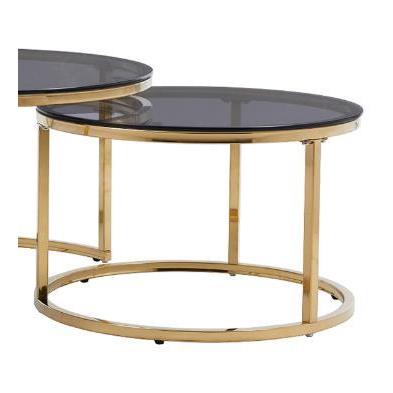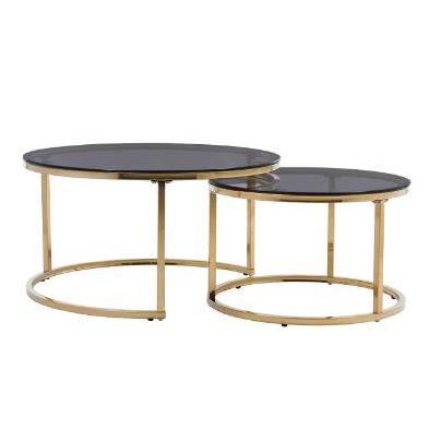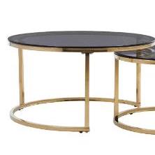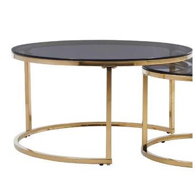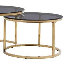 Este fantástico conjunto de dos mesas de centro redondas con cristal ahumado y estructura dorada te ofrece el toque de glamour y modernidad que tu salón necesita.Medidas:Mesa baja: 80 x 42 cm (diámetro x alto)Mesa alta: 60x 38 cm (diámetro x alto)Materiales:Tapa de cristal templado ahumado 8 mm.Patas metálicas en color dorado.