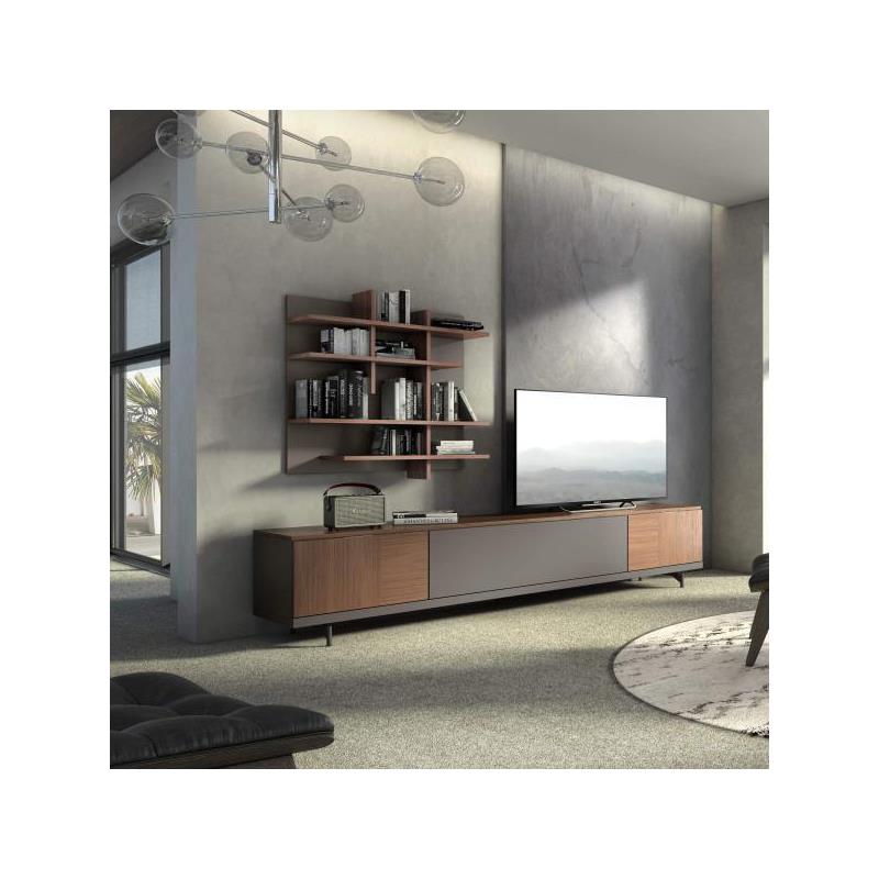 Composición de salón en chapa natural color nogal y lacado metalic. Compuesta por: módulo de Tv con pie metal, cajón y 2 puertas, y estantería colgada.Medida mueble bajo: 251x51x44 cm.Medida estantería colgada : 90x27x90 cm.