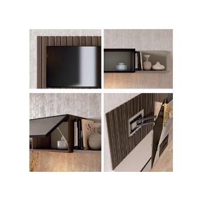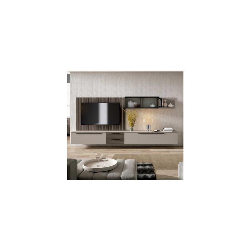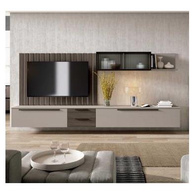 La composición de salón DAVOL 219 es una propuesta pensada para quienes buscan un espacio actual, equilibrado y funcional sin renunciar al diseño. Su combinación de acabados en color mistral y canvas aporta calidez y sofisticación, creando un ambiente sereno que encaja a la perfección en salones modernos y contemporáneos.El conjunto se articula en torno a un mueble bajo TV de líneas limpias, que ofrece una solución práctica de almacenaje para mantener el salón siempre ordenado. Los frentes lisos se combinan con detalles en acabado madera, aportando contraste visual y profundidad al conjunto. El panel trasero con listones verticales enmarca la zona de la televisión y se convierte en el punto focal de la composición, añadiendo textura y un marcado carácter decorativo.Completa la propuesta un módulo alto suspendido, ideal para exhibir objetos decorativos, libros o piezas especiales, aportando ligereza visual al conjunto y reforzando la sensación de amplitud en la estancia. Su diseño suspendido ayuda a crear un salón más despejado, actual y bien organizado.La composición DAVOL 219 es una solución versátil que combina estética, funcionalidad y diseño contemporáneo, perfecta para crear un salón acogedor, ordenado y con personalidad propia. Un mueble pensado para disfrutar del día a día y convertir tu salón en el verdadero corazón del hogar.Medidas: 330x45x149 cm (ancho x fondo x alto).