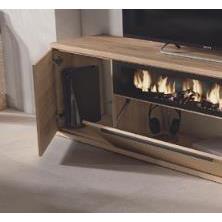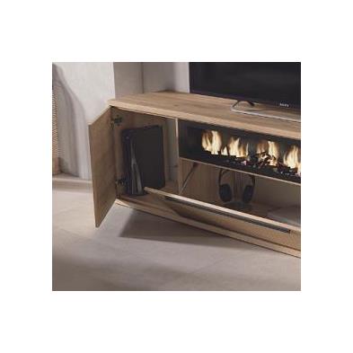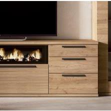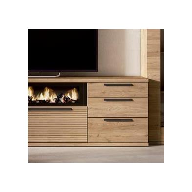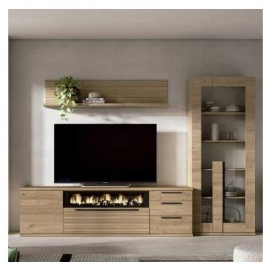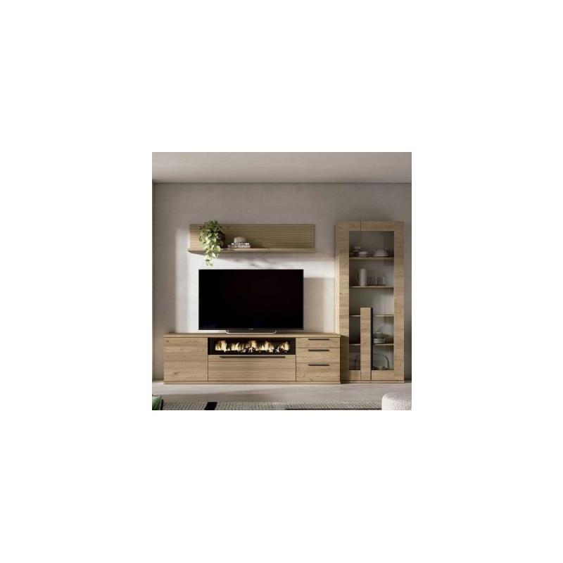 Composición de salón formada por mueble tv, vitrina y estante a pared. Detalle chimenea decorativa. Acabado en nature y rayado.