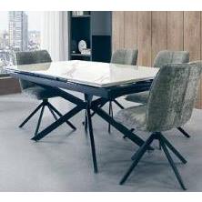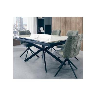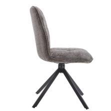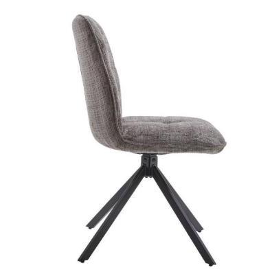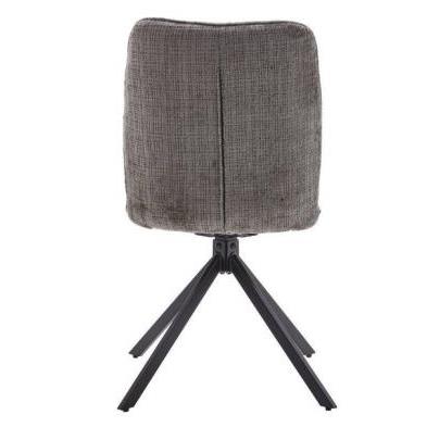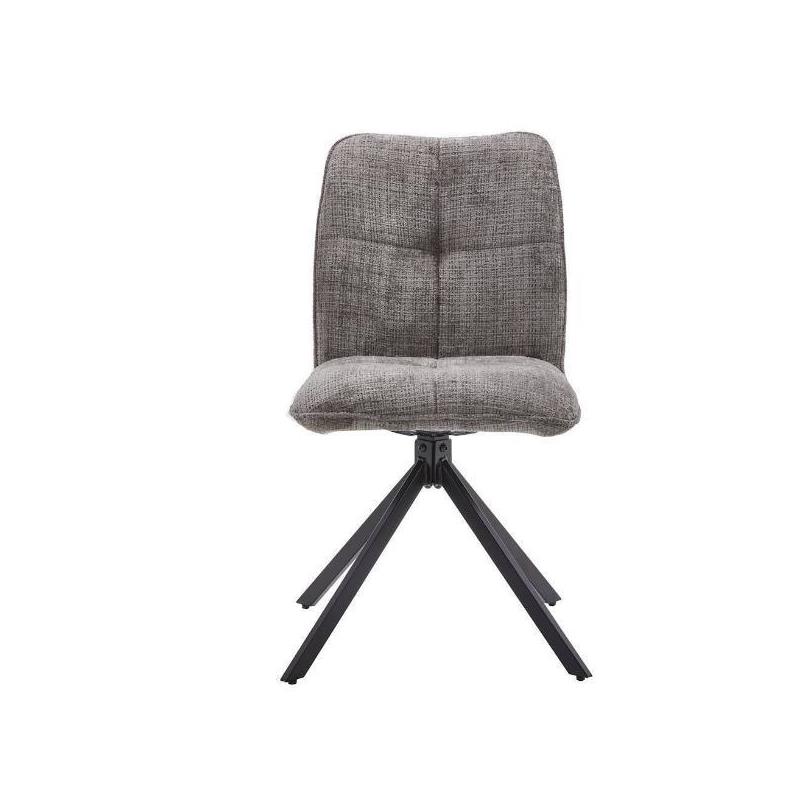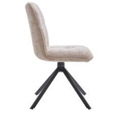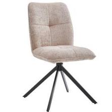 Silla con respaldo y asiento acolchados tapizados en tela color beige y pata metálica en acabado negro mate, con mecanismo giratorio de 360º. También disponible en color gris. Se sirve en cajas de 4 unidades. Medidas: 47*52*87 cm.